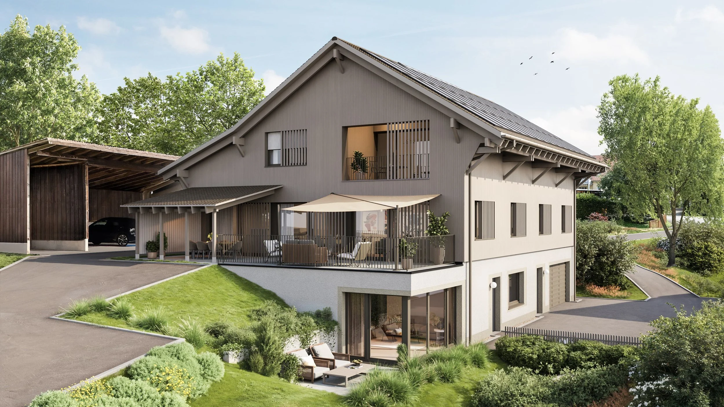Auch das Thema Nachhaltigkeit wird bei AUREUM gross geschrieben: Die Holzfassade wird durch eine leistungsstarke Photovoltaikanlage und eine umweltfreundliche Luft-Wasser-Wärmepumpe ergänzt. So verbinden sich ökologisches Bewusstsein und moderner Wohnkomfort auf ideale Weise.